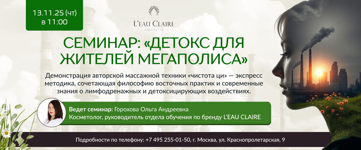 ВЕДЕТ СЕМИНАР: Горохова О.А., косметолог, руководитель отдела обучения по бренду L’EAU CLAIRE
